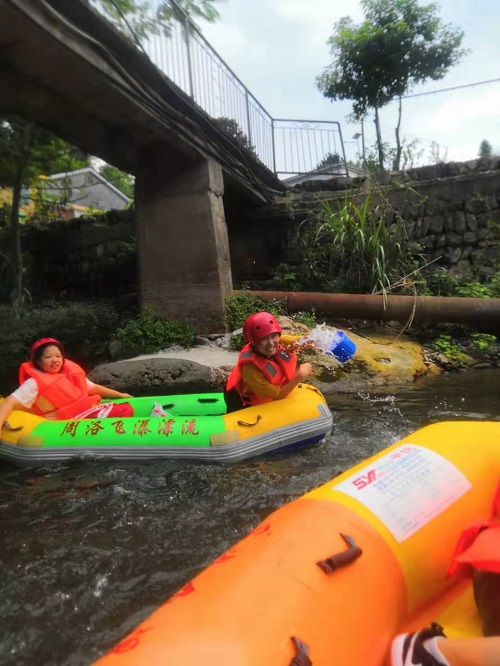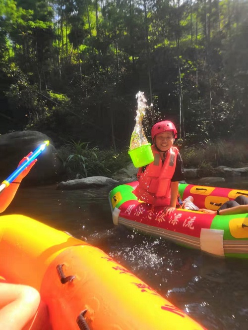 紧接着大家来到了周洛大峡谷漂流,所有人员2-3人一组共分成了10组,大家坐上皮划艇,在弯曲的河道里被水流左推右拉,或在风口浪尖上颠簸,或在惊涛拍岸中搁浅,欢呼声、尖叫声响彻在山谷……