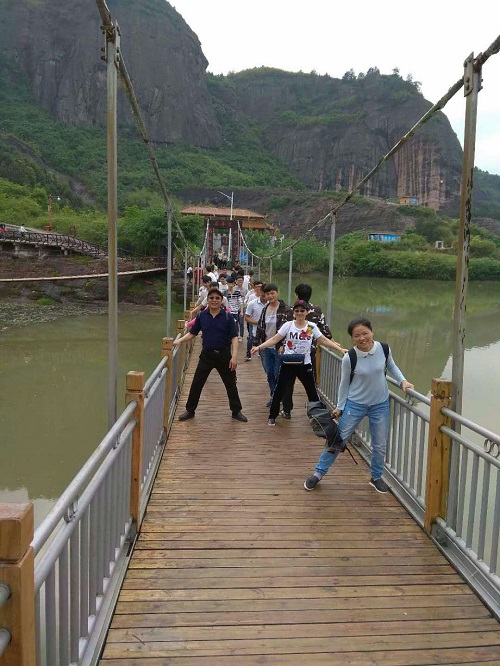 到达目的地后,大家迫不及待地开始了登山之旅,从山脚行至山顶,一步一步,互相扶持。穿梭在丹霞山谷间,一路风景如画,人如入画中。近处的丹霞山衬托出远方绝壁高山的雄伟、高大,若耸天的石柱,更像参天的石墙。绵延十数里丹岩绝壁如若一张展开却看不到尽头的画卷。绝壁中石山姿态万千,有若佛陀,有像猕猴的,有貌若美人,有形似金龟……。在丹霞山中谷穿梭,随着视角的改变,绝壁上面的面相也会发生变化,又如电影荧幕一般神奇,这如画的美景,瞬间将大家登山的辛苦一扫而光,所有人脸上都露出了舒展如花的笑容。