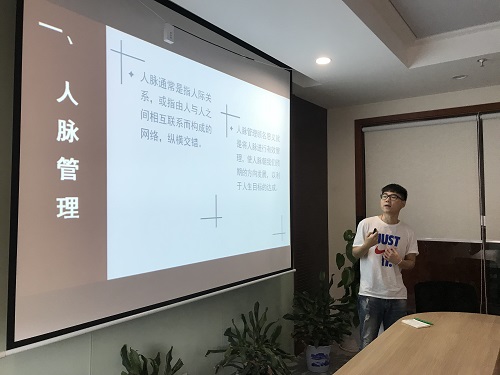 6月23日,总部青年员工学习研讨班第一次课题分享在5楼会议室举行,财务部童蔼尧、运营二部姚翱分别带来了《阳光心态》及《人脉管理》。